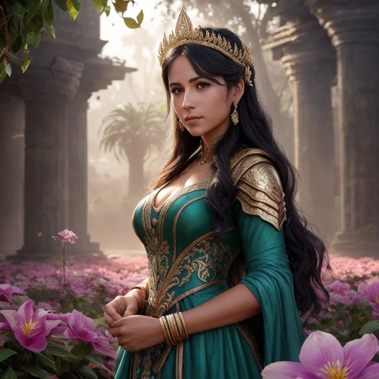 A regal woman stands amidst blooming flowers, dressed in a vibrant teal gown adorned with gold accents. Her long hair cascades elegantly, embellished with flowers, exuding an air of grace and strength.