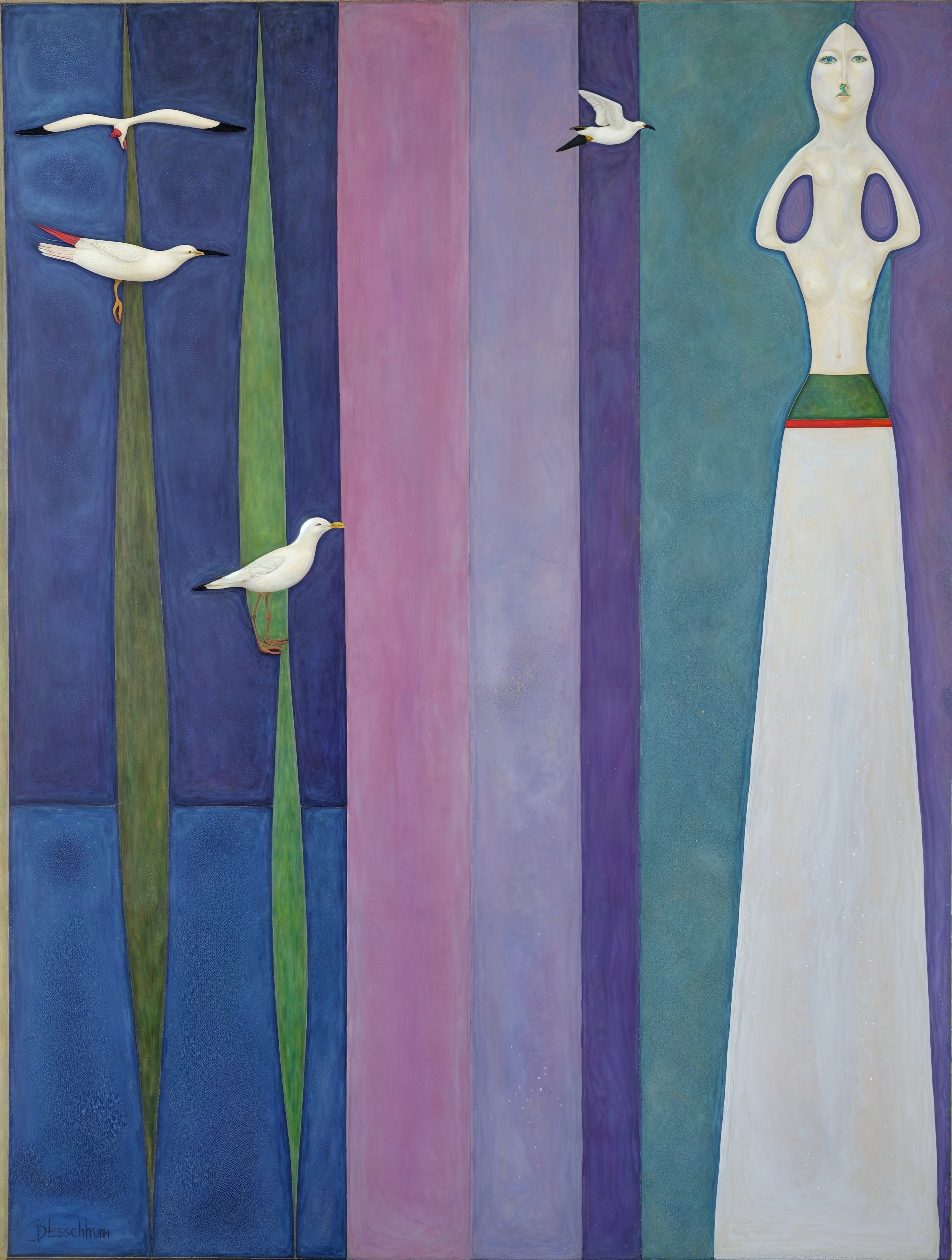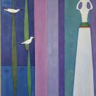 The image features a vibrant abstract composition with stylized birds, geometric shapes, and a figure with a bird-like head, all rendered in bold colors and smooth lines.