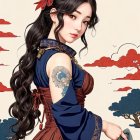 A pixel art character in a flowing blue dress runs joyfully through a whimsical landscape, featuring stylized clouds and colorful trees, embodying a sense of adventure and freedom.