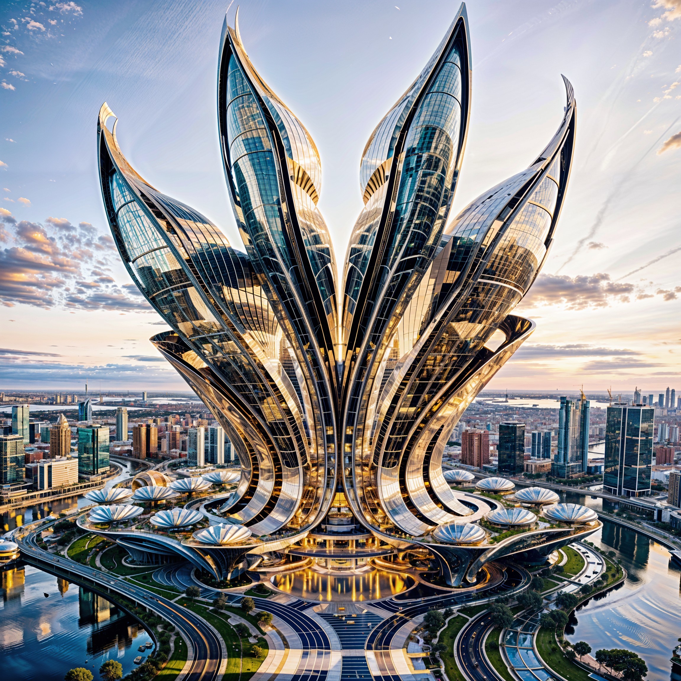Futuristic high-rise building with petal-shaped glass towers amid an urban landscape during sunset.