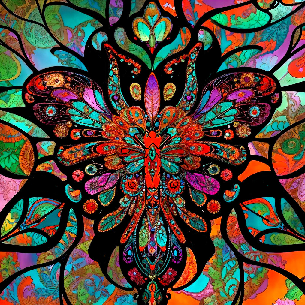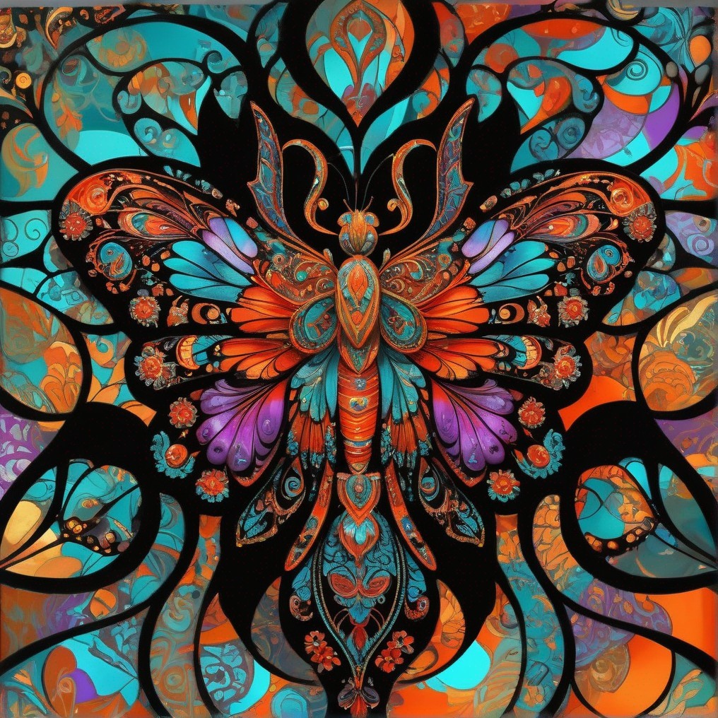 create an image of a beautiful butterfly with bright orange, teal, purple and red wings. The wings are paisley and outlined in black.