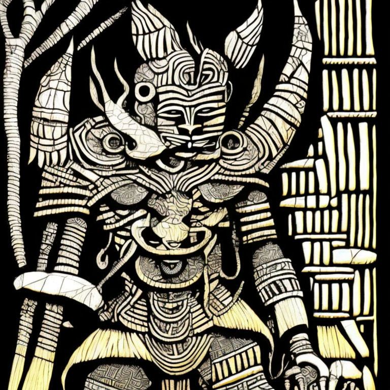 Detailed tribal mask digital artwork with feathers, bones, and textures