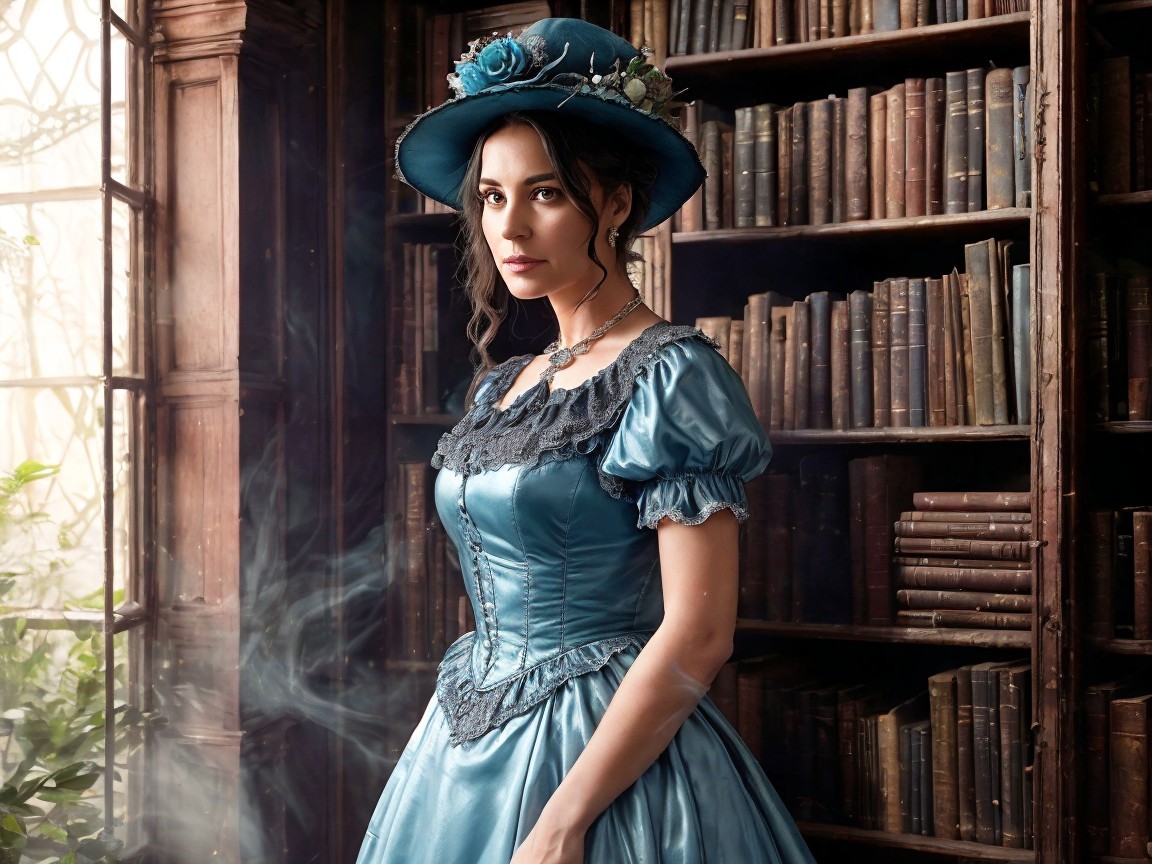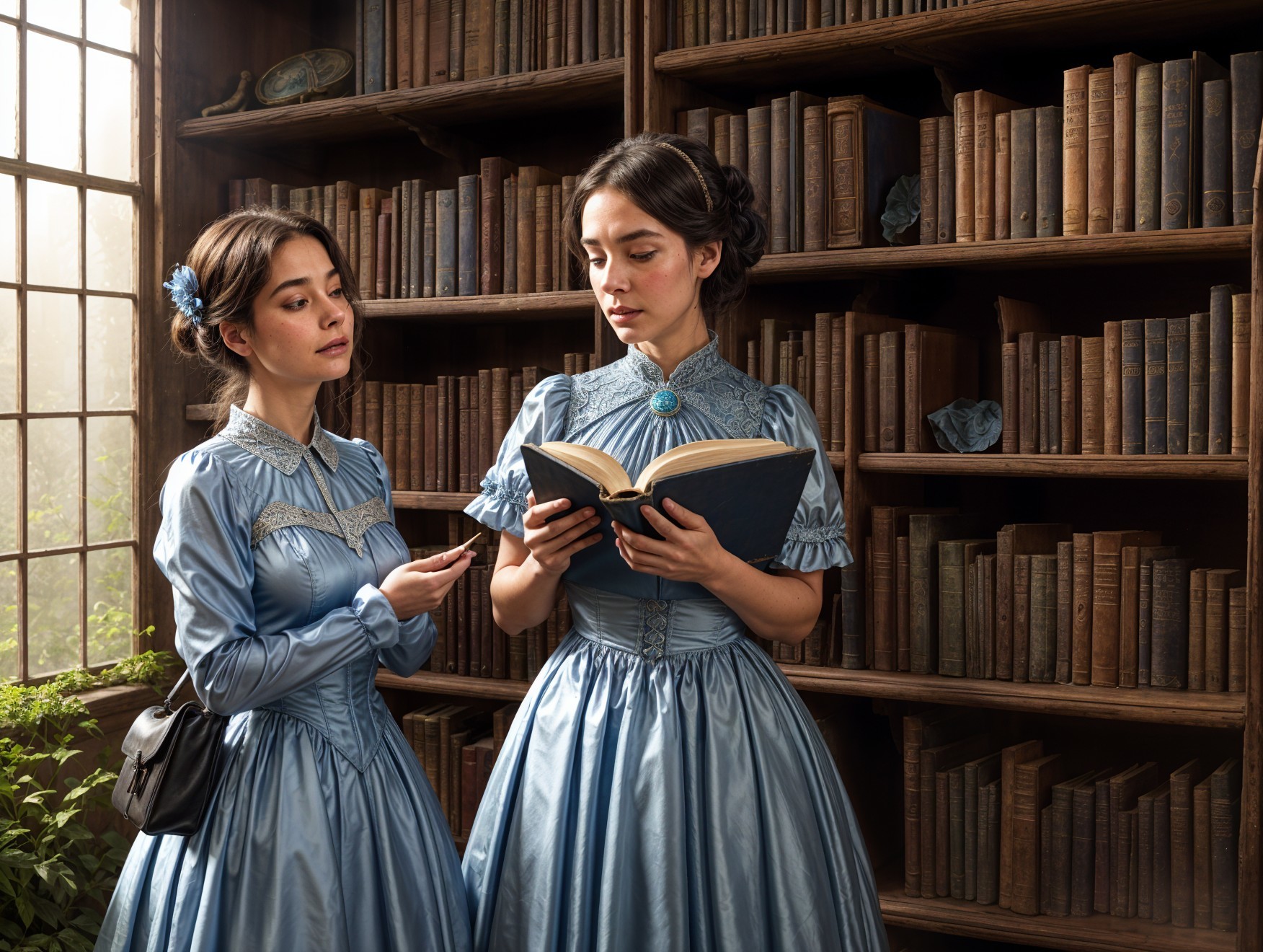 In a dimly lit library, two women in vintage white dresses read intently. One holds a candle, casting a warm glow, while the other reads from a book, surrounded by shelves of books.