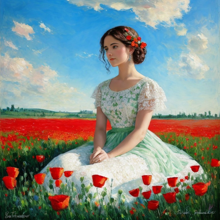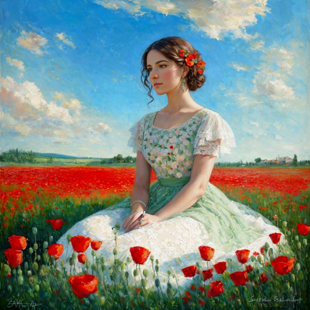 Prompt: "Thick palette knife drawing, impasto, art by Beth Conklin and Esteban Cortazar: a pretty girl sitting in a garden of red tall poppies. The red flowers color pops up against the light blue sky. large brush strokes, oil painting, she is wearing a white and green lace dress."