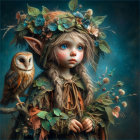 A young girl with butterfly-like ears wears a floral crown and a green cloak, holding an owl. She's surrounded by a mystical forest, evoking a whimsical, enchanted atmosphere.
