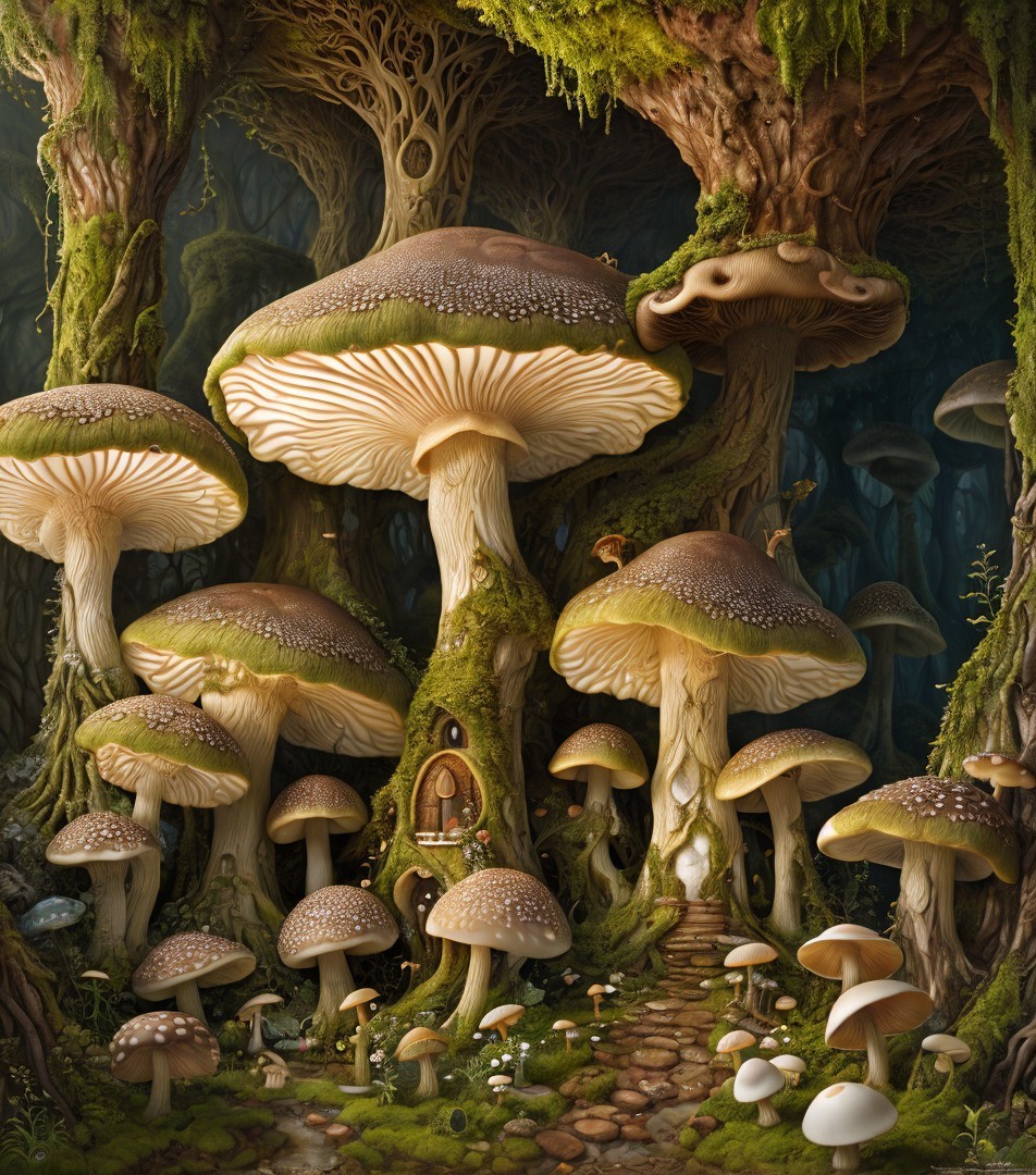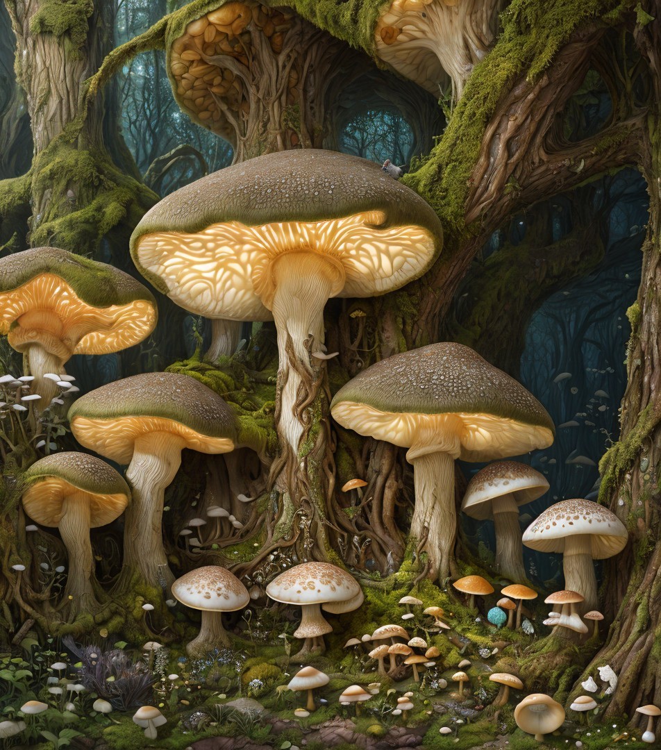 Prompt: Biomorphic architectural symbiogenesis of a mushroom and a rococo chapel, roots and moss, by yacek yerka, gediminas pranckevicius, stefan morrell, hyper-detailed, insanely intricate, high definition, award winning, photorealistic acrylic art