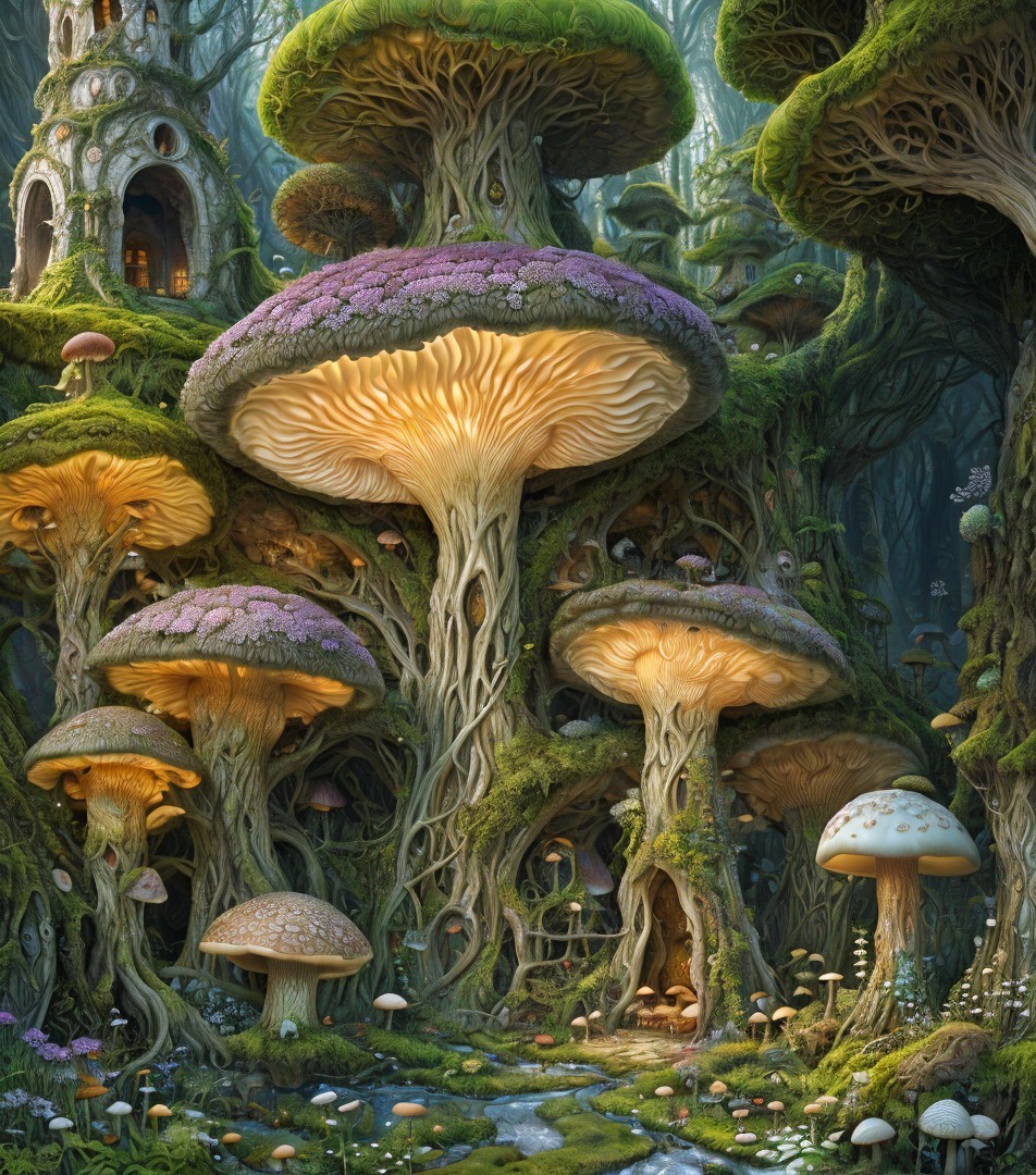 + Prompt:Biomorphic architectural symbiogenesis of a mushroom and a rococo chapel, roots and moss, by yacek yerka, gediminas pranckevicius, stefan morrell, hyper-detailed, insanely intricate, high definition, award winning, photorealistic acrylic art