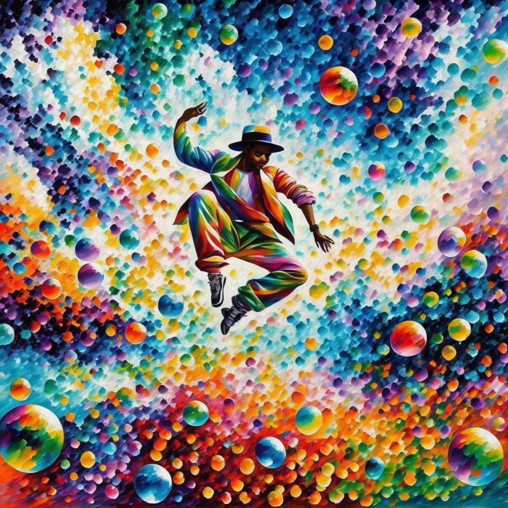 A vibrant painting of a multicolored bird in flight over a colorful townscape with swirling skies and floating bubbles.