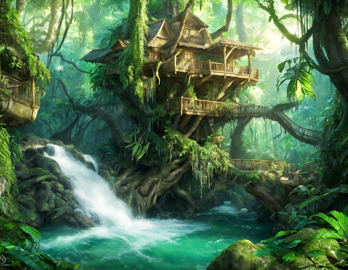 Prompt: Disney Tarzan's treehouse in lush jungle rainforest with vines, cascading waterfalls, rushing river, and natural stone steps sppiraling up cliffs