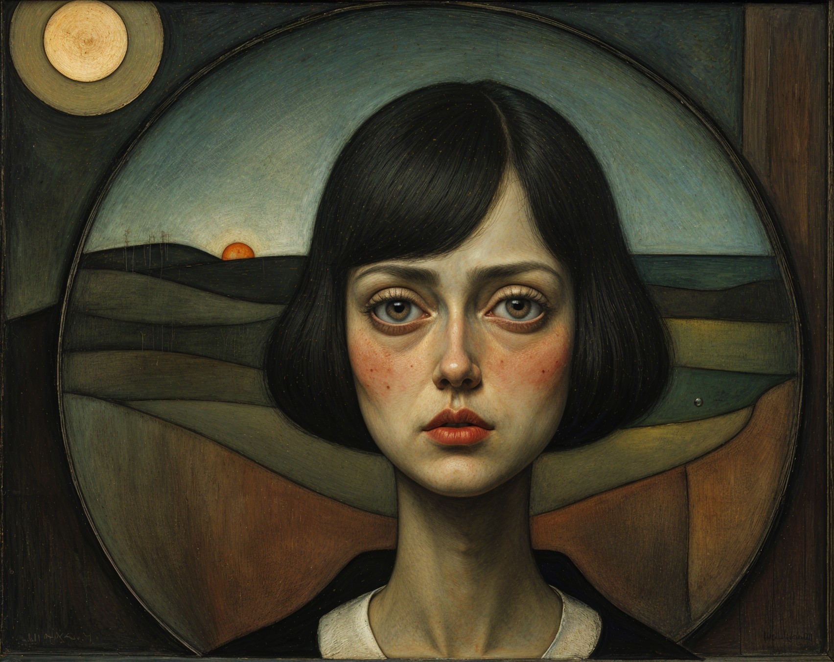 A striking portrait of a young man with dark hair and bold red lips, set against a surreal landscape of rolling hills and a luminous moon. The mood is both mysterious and dramatic.