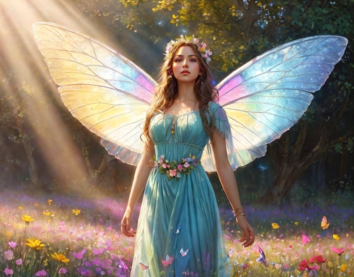 Beautiful fairy with angelic face and translucent colorful wings standing in a sunlit meadow with flowers and butterflies and trees around it, oil painting.