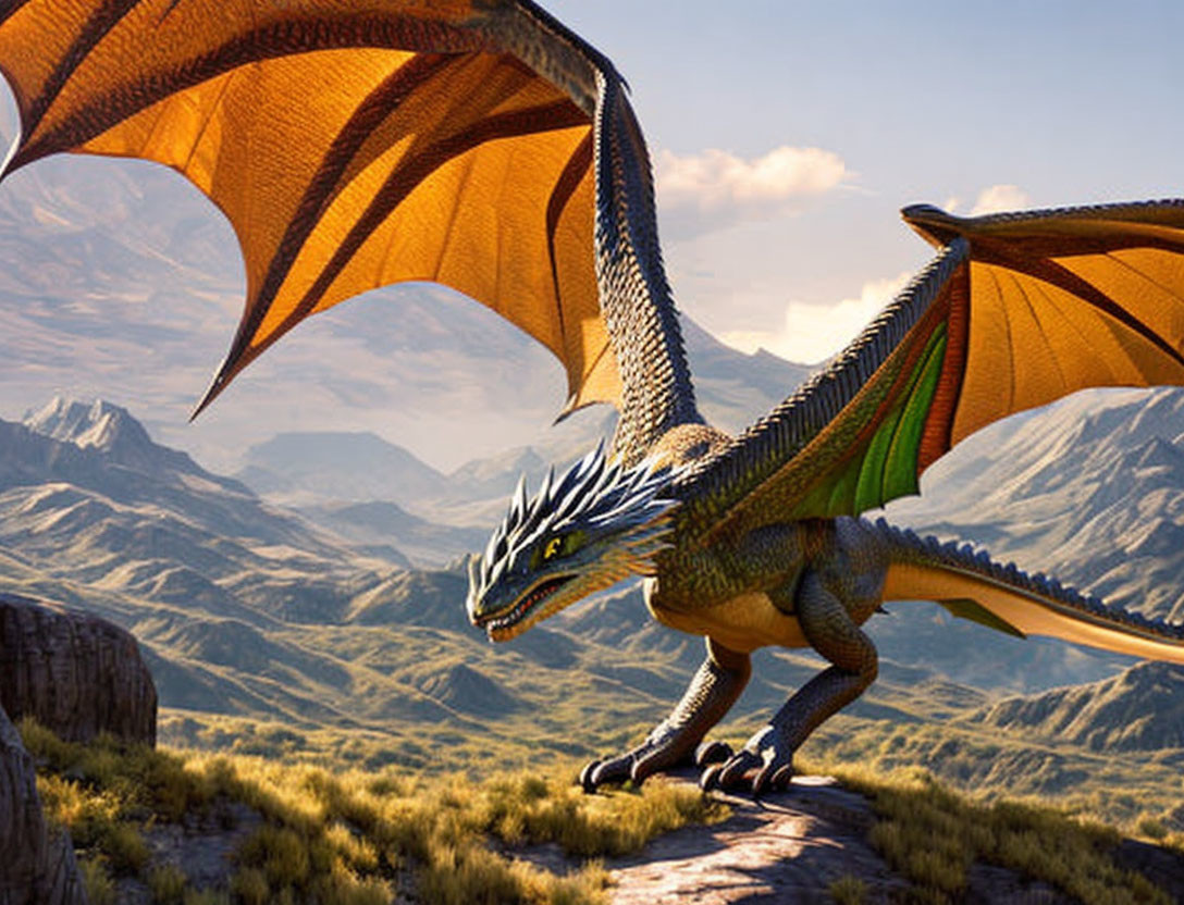 Majestic dragon perched on rocky cliff with widespread wings