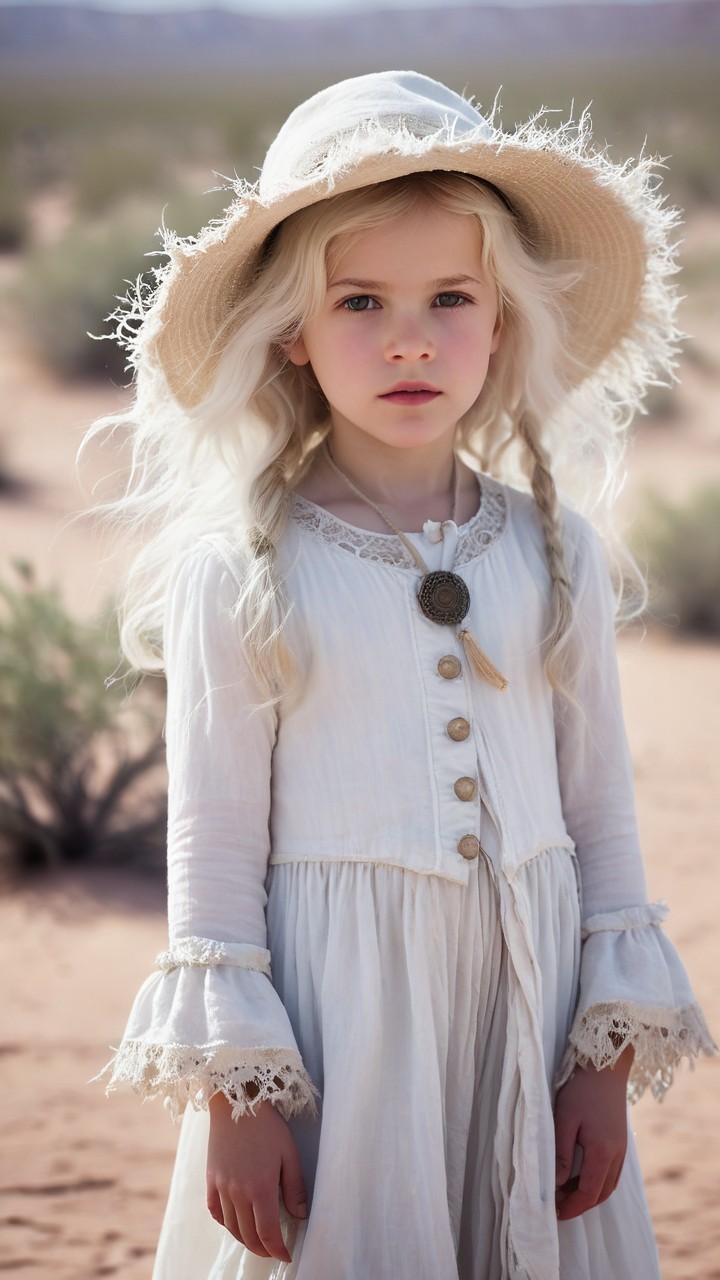 A young girl with long, wavy blonde hair stands in a desert landscape, wearing a vintage white dress and a wide-brimmed straw hat. She gazes thoughtfully into the distance.