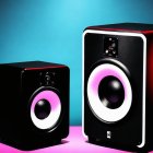 The image features two pixelated speakers on a vibrant pink surface. One speaker has a brown circular design, while the other showcases a white circular pattern, all against a bright blue background.