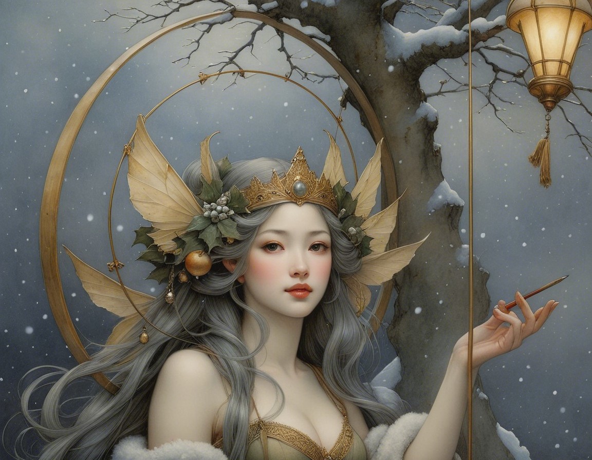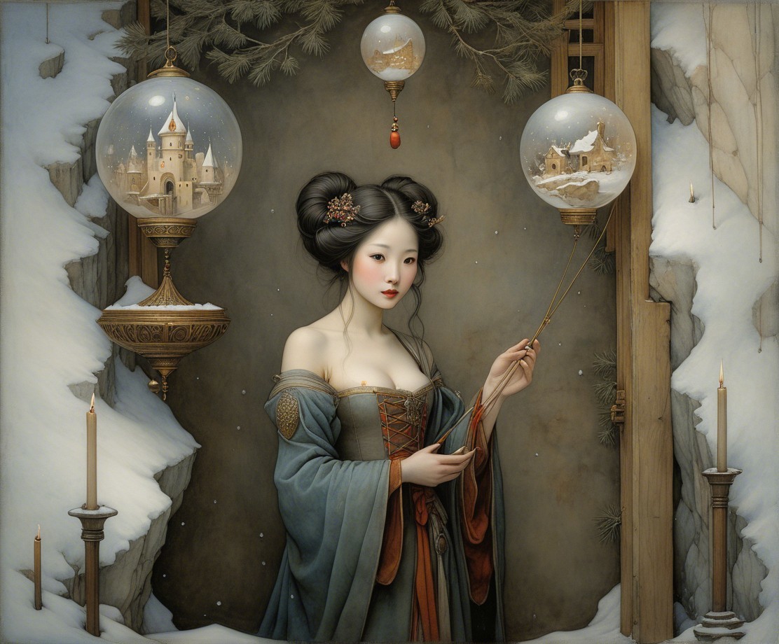 A serene woman in a snowy scene holds a bird, framed by ornate architecture. Snowflakes fall gently, and festive globes displaying winter settings enhance the enchanting atmosphere.