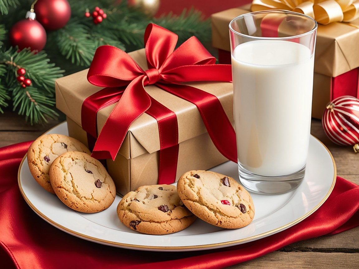 A cozy holiday scene features a beautifully wrapped gift with a red-velvet ribbon, accompanied by a plate of cookies and a glass of milk. Twinkling lights and a fireplace create a warm ambiance, enhancing the festive spirit.