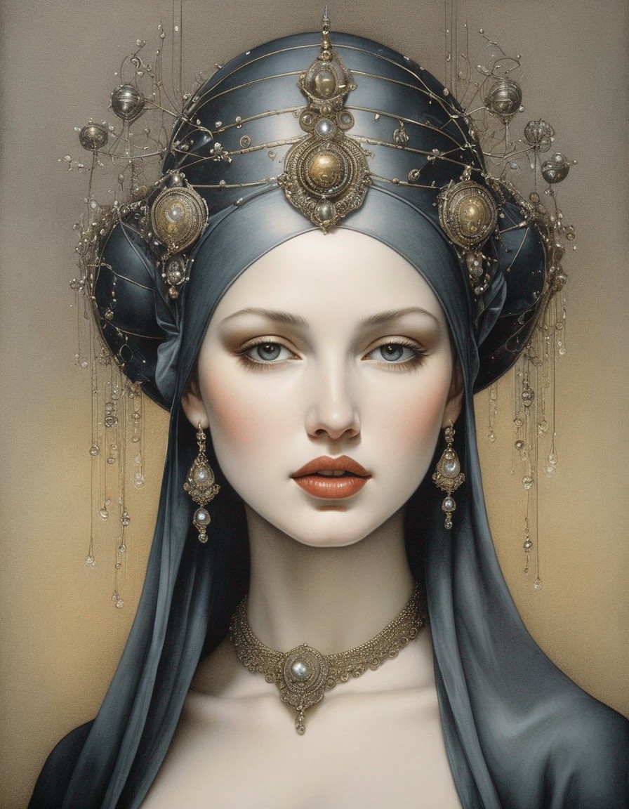 A portrait of a woman with an intricate headdress, featuring pearls and golden ornaments, set against a beige backdrop.