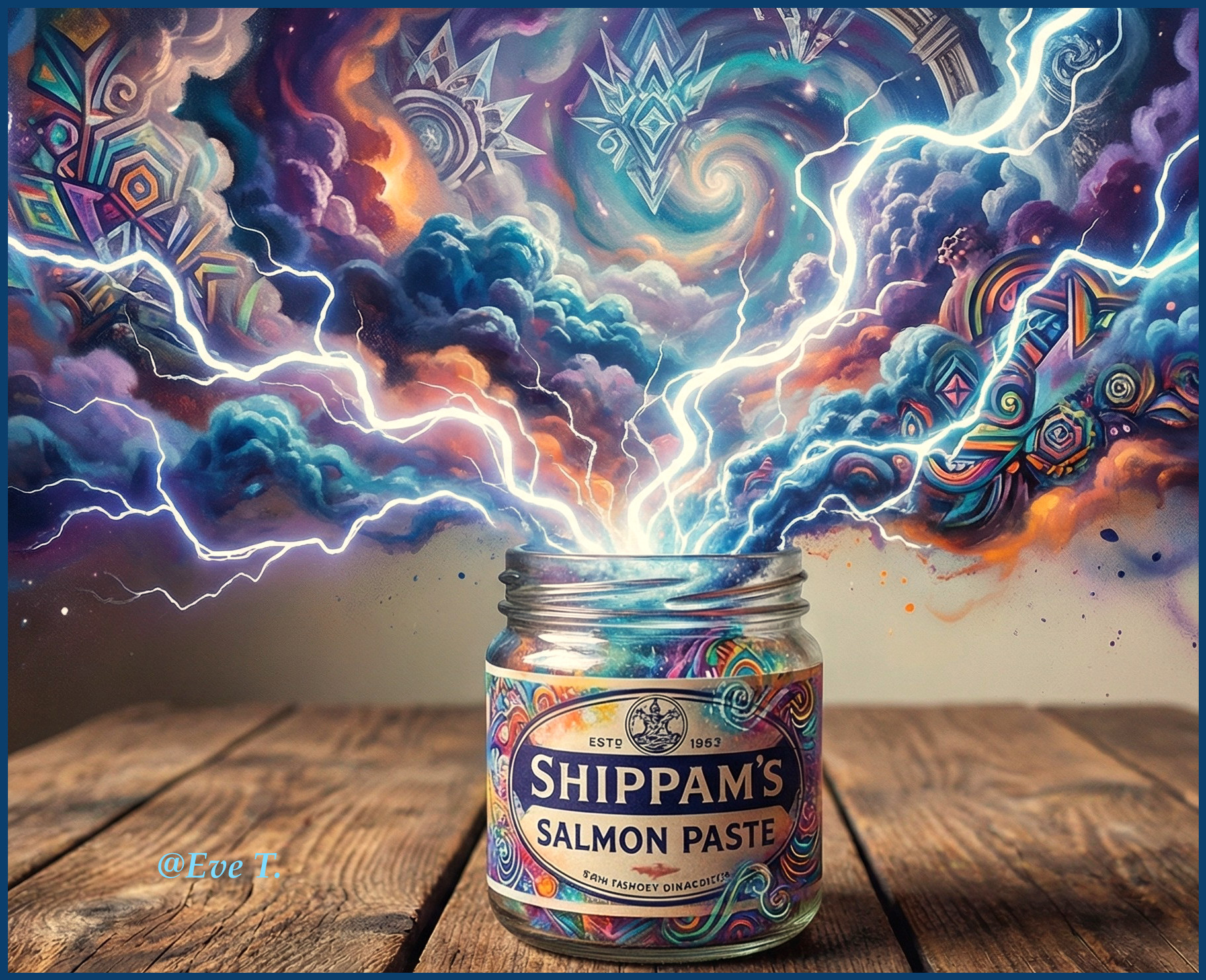 A wide shot depicts a glass jar labeled "SHIPPAM'S SALMON PASTE" creating a colorful, fantastical lightning storm in an abstract style as it rests on a wooden table. The jar, placed slightly off-center to the right, has patterns of blue, green, yellow, orange