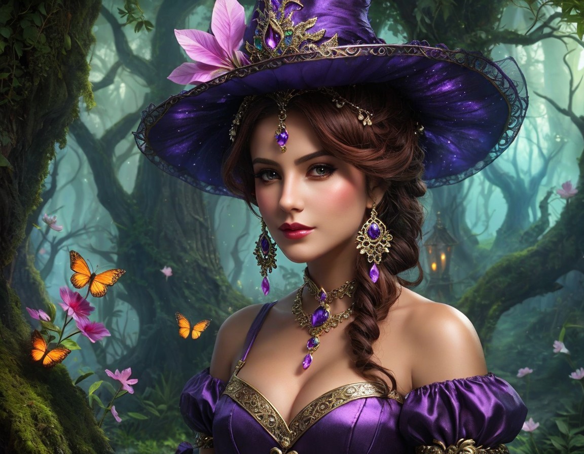 A woman in a vibrant purple gown adorned with gold accents and flowers, stands in a lush forest. She wears an elaborate hat and jewelry, with a large bee hovering nearby, adding a whimsical touch.