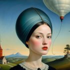 A stunning portrait of a woman with a high bun hairstyle and elegant attire, set against a picturesque landscape with rolling hills, quaint villages, and a serene lake under a bright sky.