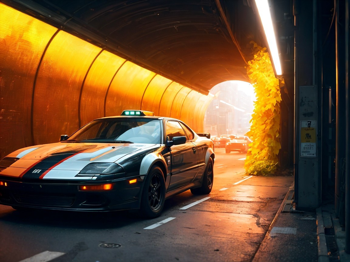 A sleek silver sports car with a black stripe stands under an illuminated overpass. Autumn trees surround the scene, and a warm glow creates a dramatic atmosphere on the wet pavement.