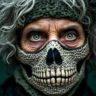 A striking portrait of an older woman with wild, gray hair and vibrant green eyes. She wears a mask resembling a skull, enhancing the eerie and mystical atmosphere of the image.