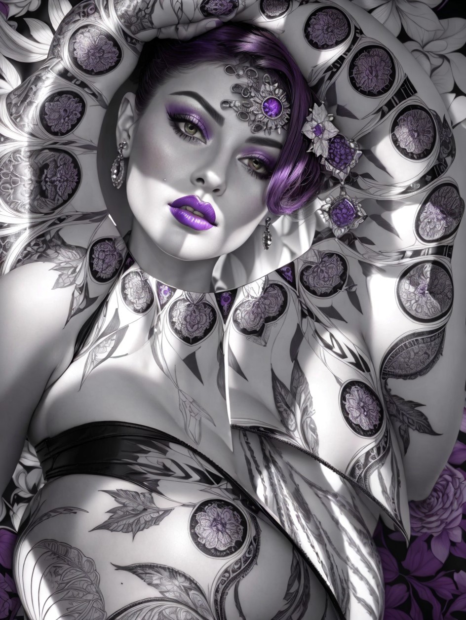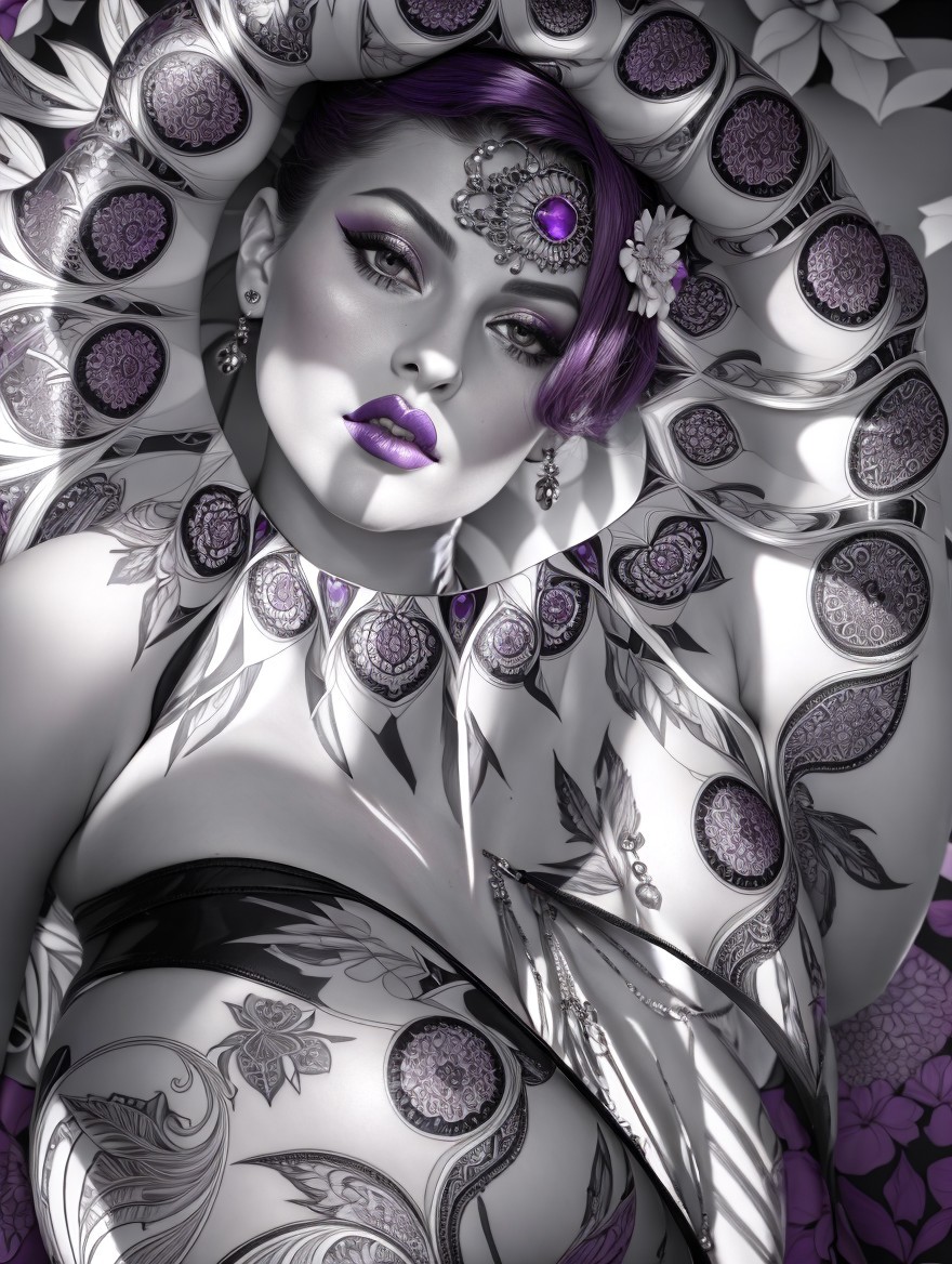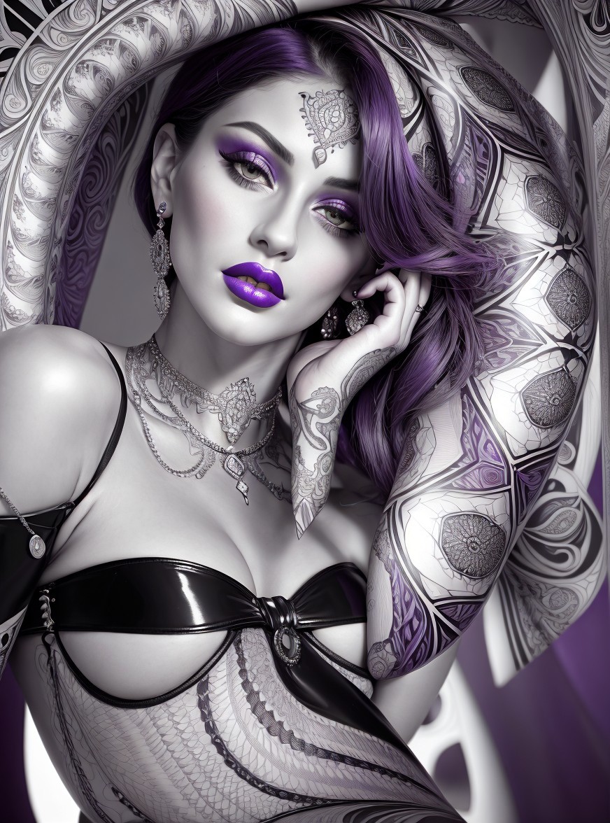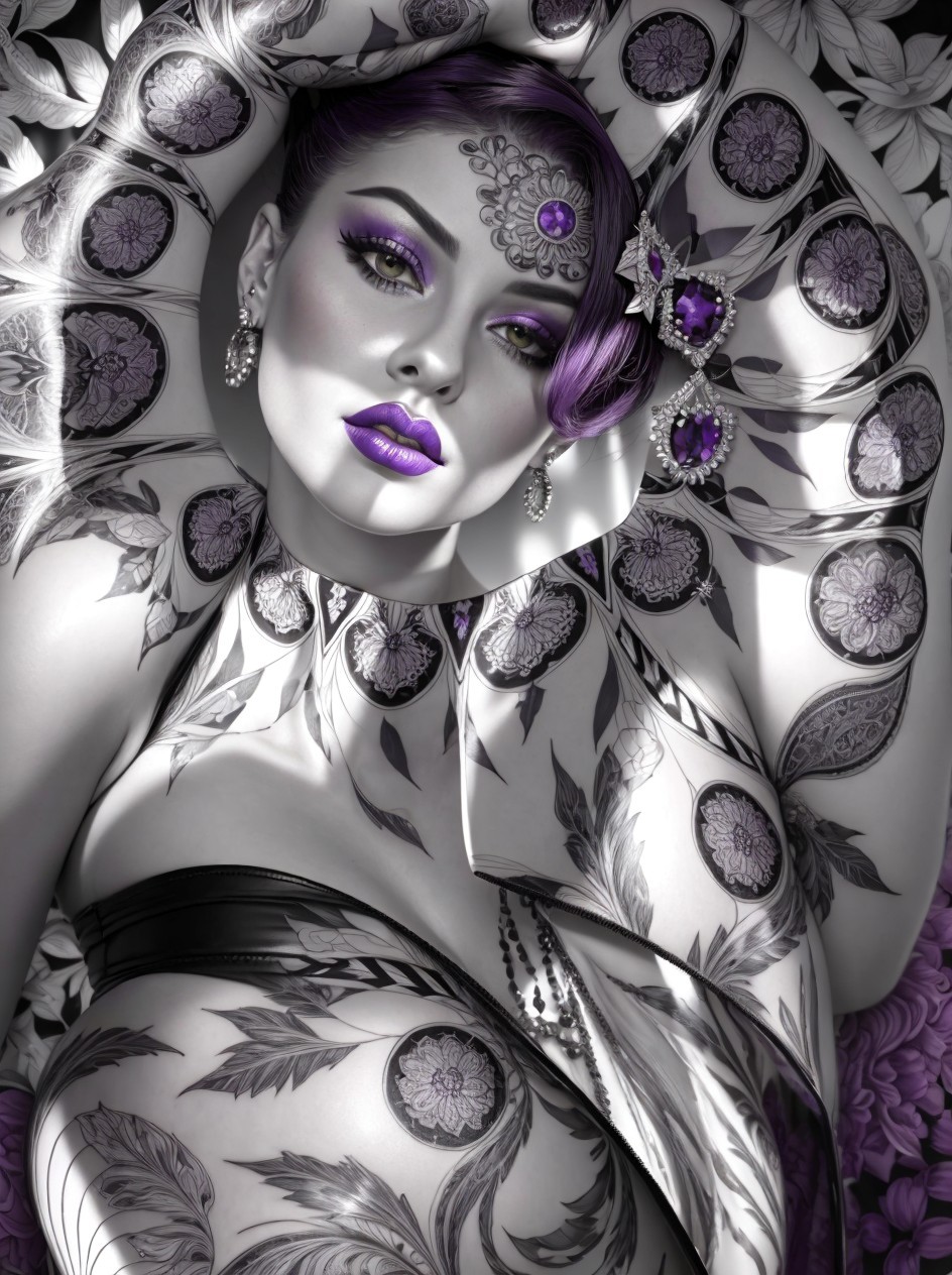 A grayscale image with purple accents featuring a woman with dramatic makeup and tattoos, adorned with elaborate jewelry, posing against an ornate background.