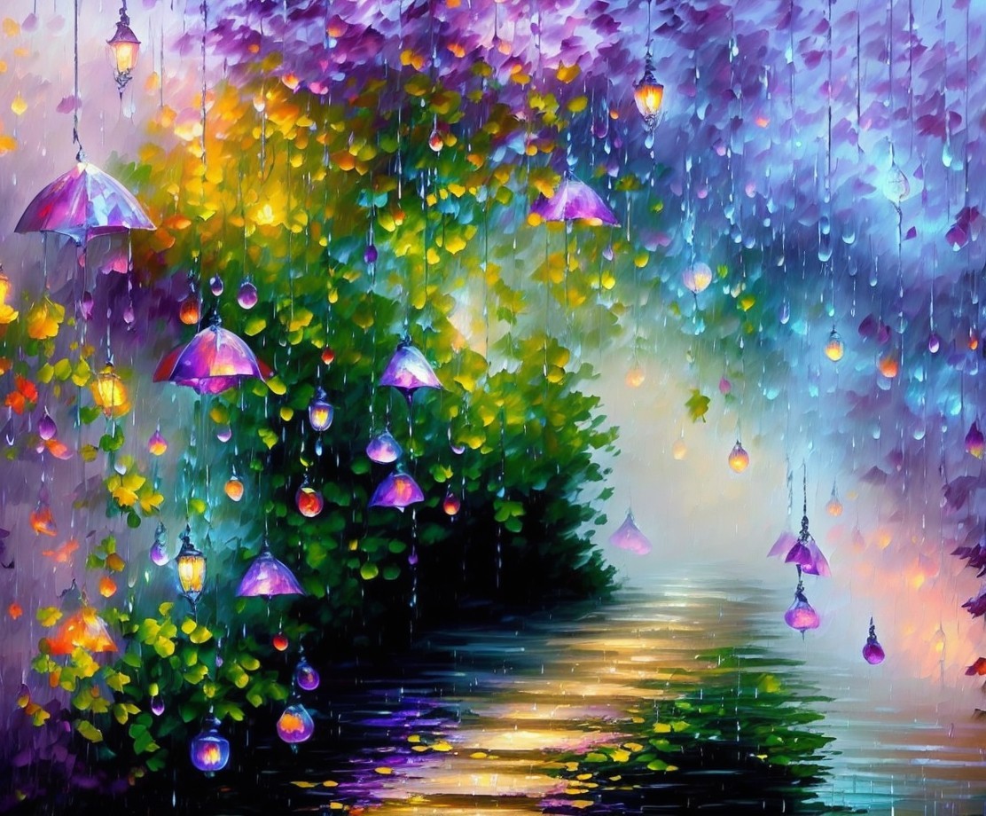 Rainy night ambiance, blurred nature scene, misty rain effect, vibrant colors, textured brush strokes, artistic interpretation, Leonid Afremov inspired style, glowing lanterns, shimmering raindrops, reflections on wet pavement, silhouettes of trees, cozy atmosphere, dreamy and romantic, digital painting, high resolution, rich blues, greens, and purples, warm streetlights, peaceful and tranquil mood.