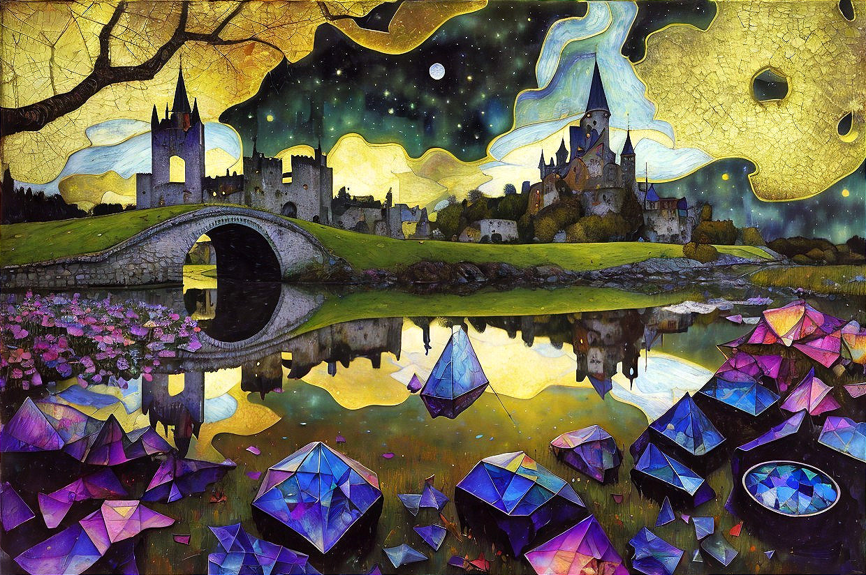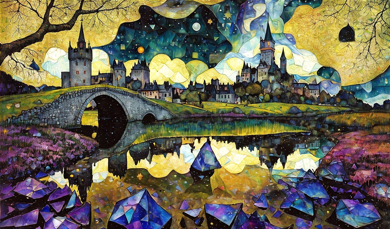 Prompt: bridge and castle by lake under cosmic sky, by Egon Schiele, Paul Klee mixed media, depth of field, parts of background made out of glass shards, metallic ink details and realistic textures created by Dave McKean and Richard Corben