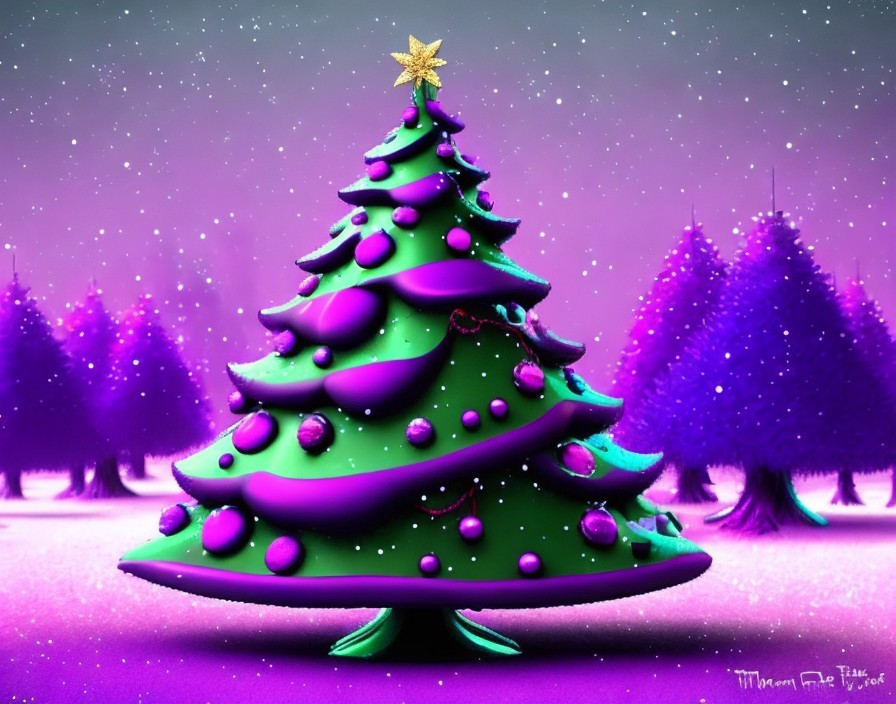 Vibrant green Christmas tree with purple ornaments and yellow star in twilight setting
