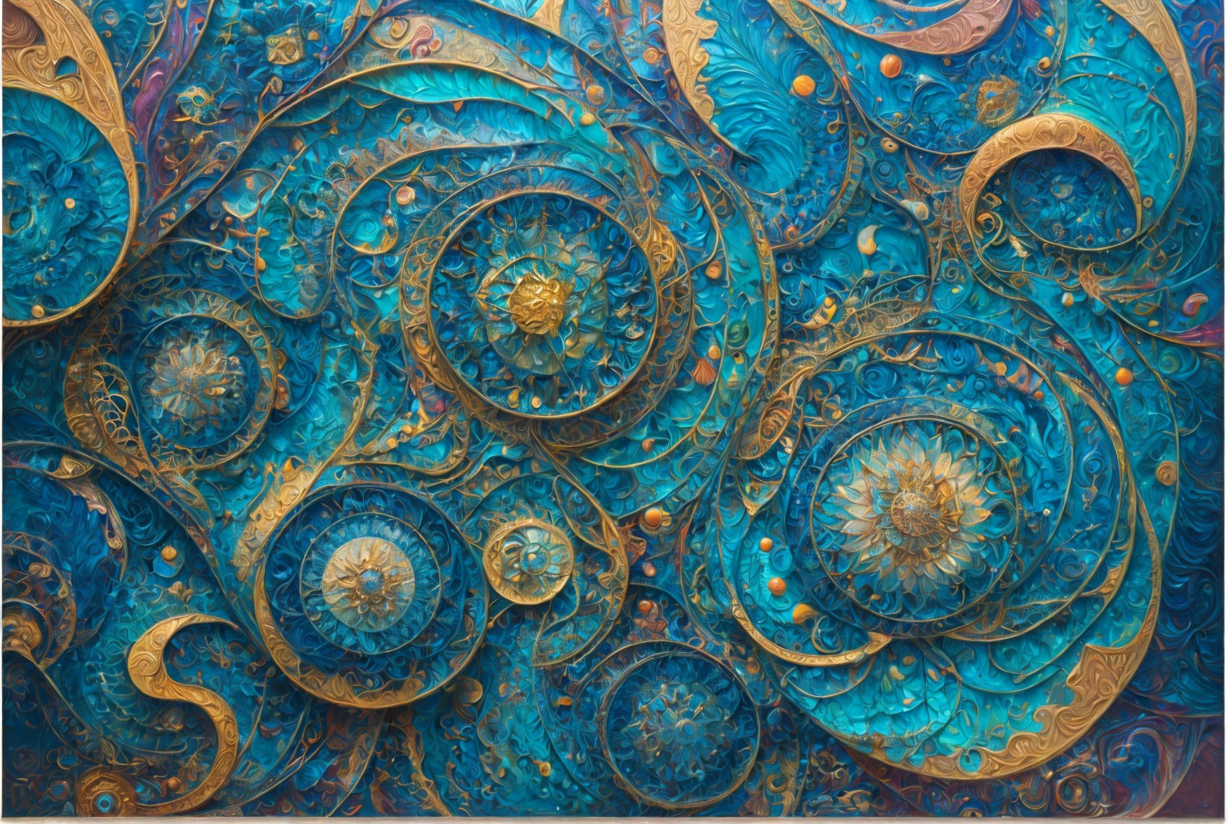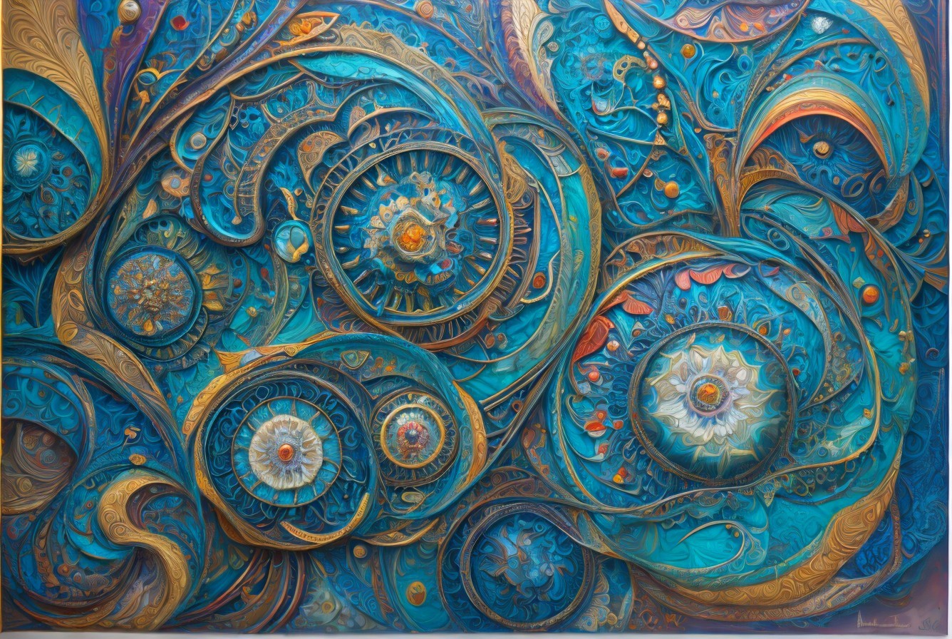 Blue and Gold Relief Sculpture with Swirls and Floral Patterns