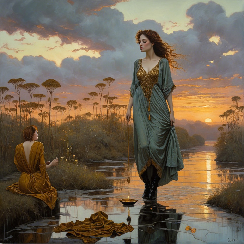 A contemplative woman in a flowing black dress gazes over a cityscape at dusk, her hair tousled by the wind. Soft lighting creates a serene, intimate atmosphere on the balcony.