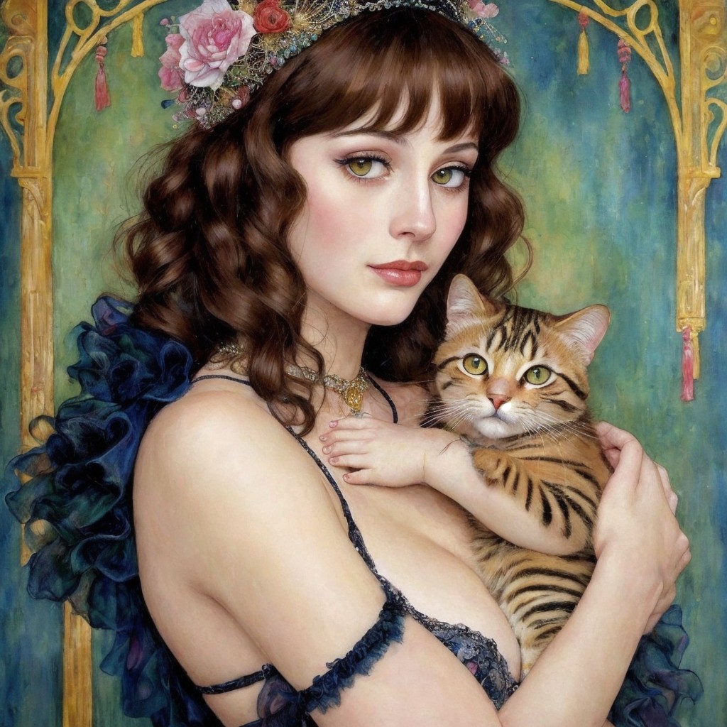 Prompt: "Bedraggled but beautiful woman clutching an aged tabby cat, Klimt paint affiche for Moulin Rouge spectacle in Paris, soft watercolor extra water in Art Deco by Annigoni, Egon Schiele, Milo Manara, Botticelli, Catrin Welz-Stein, Klimt, perfect eyes, perfect hands face, highly detailed, complementary colors, hyper detailed. Watercolor and ink splatter, dynamic pose, dark blue background, unreal engine, greg rutkowski, beeple, makoto shinkai and lois van baarle, ilya kuvshinov, tom bagshaw, alphonse mucha, global illumination, detailed and intricate environment"