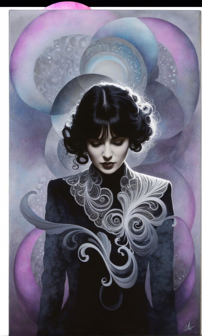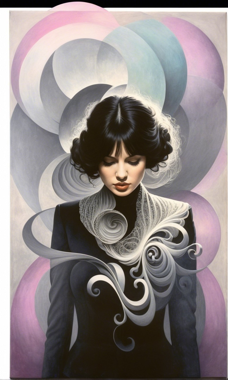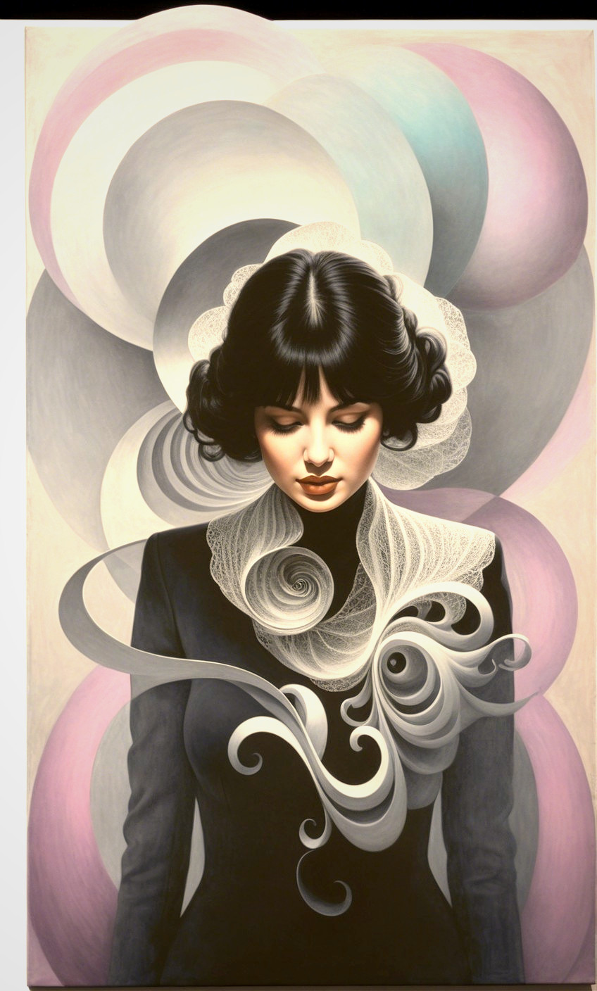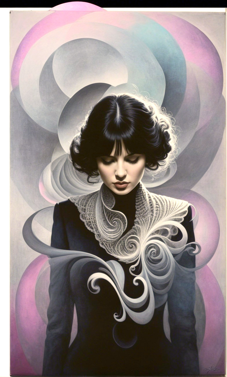 Prompt: surreal visual structure emerges on canvas, airy, catenaries, upper body portrait, stacked-up perspective, charcoal textures, hatching, stencil with modern hyperbolic surrealism. curvilinear forms, multi-layered, three-dimensional drawing, UHD, LiDAR point cloud, HDR reflectivity. Stark color contrasts, abstracted embodiment, liminal pointillism silhouette, made with pen and ink, chiaroscuro background, crackled paper, simple minimalist abstract asymmentrical line art weaves a whimsical and psychedelic ambiance. Comic book art style merged with american gothic. Blotted, stippled, tesselated. Flourescent color shapes, parallax occlusion 1.5. hues by William Bradley, subsurface scattering 1.2, quaint, mip-mapping 1.3, displacement contoured, warm purple tones, cubistic-inspired background, catenaries, organic textures by Dan Mumford and Frank Frazetta, supernatural asymmetry, unsettling, painterly effects, visible porcelain skin texture, displacement mapping, plasmatic hatchings, scratched edges, cel-shaded lighting is soft and diffused, highlighting the delicate linework features and fabric textures. The cartoon-style composition is symmetrical, with a focus on the face and hair, creating a sense of harmony and mystery. Henri de Toulouse-Lautrec influence, Bloom-Effect, interpolated, serene expressionism by Ed Binkley, diffused reflections, mip-mapping, displacement mapping, parallax occlusion, quaint, enlarged shadows, soft rain falling. Golden hour atmosphere, delicate luminous coloring, whimsical swirling patterns. Plasticity 1.7, harmoniously sculpted features, illusion of flowing hair, amidst ethereal layers of fabric merging with turbulent flares, liminal, luminism 1.6, plasticity 1.9, dynamic lighting effects and ambient occlusion by Ho Baron, lighting of Ed Paschke, hatching, triadic color scheme lilac light-puple warm-grey, color palette by Overton Loyd, Man Ray's and Albert Bierstadt's influence, merging tonalism, sfumato, Gelsculpt 128K rendering, push-processing technique with a wavery texture patchwork, juminocore elements, debeh effects akin comic book illustration art and dark fantasy style blended with whimsical surrealism, acrylic and ink on canvas, visibly textured, negative Lucas numbers, extreme variety of colors,stylilzation 1.3, <LoRA:xl_more_art-full_v1:0.8>,<LoRA:add-detail-xl:1.0>. unveiling novelty architecture in warm pastel hues. The cel-shaded drawing style adds depth, depth of field, bokeh, revealing pellucid details in a fusion of juminocore and grunge aesthetics, warm tones, curated by Overton Loyd, tints of Brad Kunkle, dynamic lighting 1.5, geometrical line-art, warm red gradients, soft lilac hues, catenaries, lineage, abstract organic shapes, intricate geometrical designs.