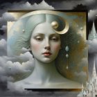 A striking portrait of a woman with flowing white hair, set against a mystical backdrop of clouds and a moonlit night, featuring an ornate castle in the foreground.