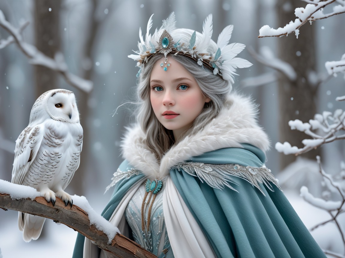 A serene figure with silver hair wears a regal blue cloak adorned with feathers and jewels, standing beside a snowy owl in a tranquil, snowy forest, capturing a magical winter ambiance.