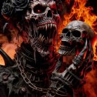 The image features a striking figure with a skull-like face and vibrant red hair, clad in intricate armor. They control flames, surrounded by a dramatic backdrop, exuding a fierce, otherworldly energy.