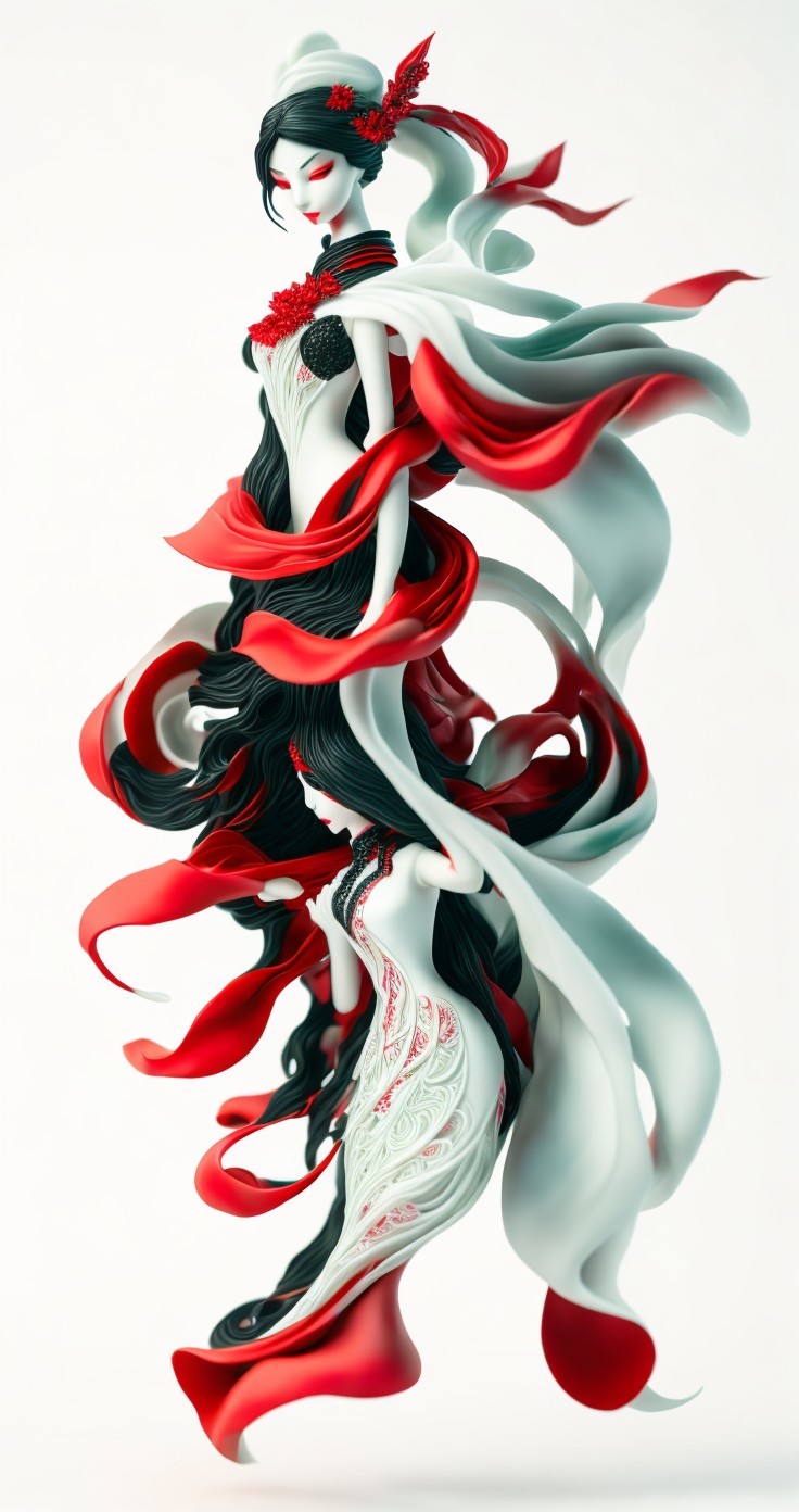 The image features two elegant figures intertwined, adorned in striking black, white, and red flowing garments. Their dynamic poses and long, flowing hair create a sense of movement and grace.