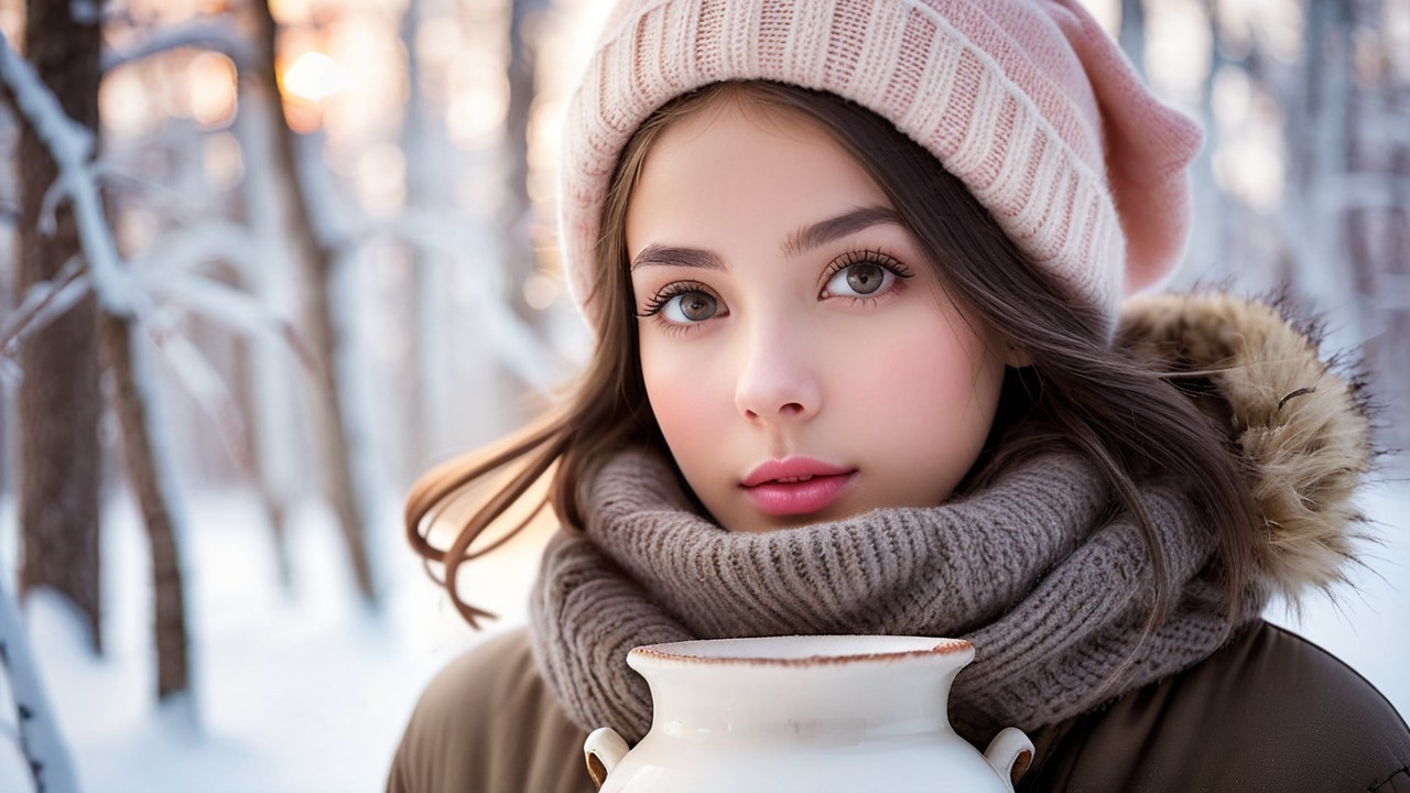 A young girl in a cozy winter outfit, wearing a pink knit beanie and a thick scarf, holds a ceramic pot. She's surrounded by a snowy forest, with soft snowflakes falling around her.