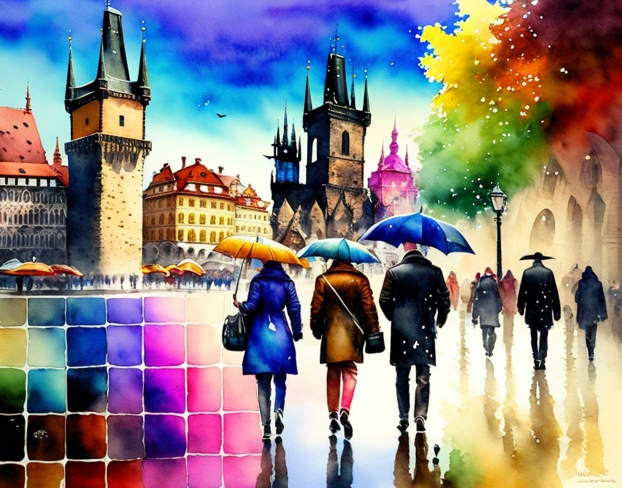 Prompt: "Watercolour art showing romantic view of famous Old Town Prague square with clock tower and gothic church, people walking in the rain with colourful umbrellas"