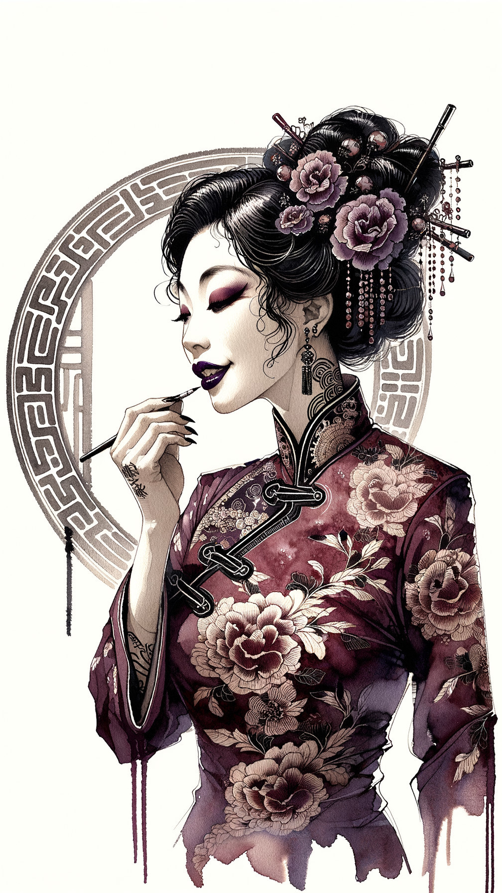 A graceful woman in a richly decorated dark dress adorned with peonies stands against a circular backdrop, holding lipstick and getting ready. Her intricate tattoos and elegant hairstyle highlight her beauty.