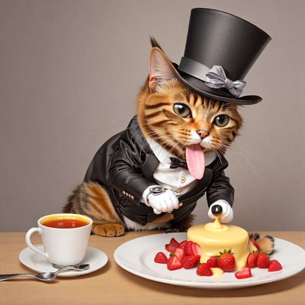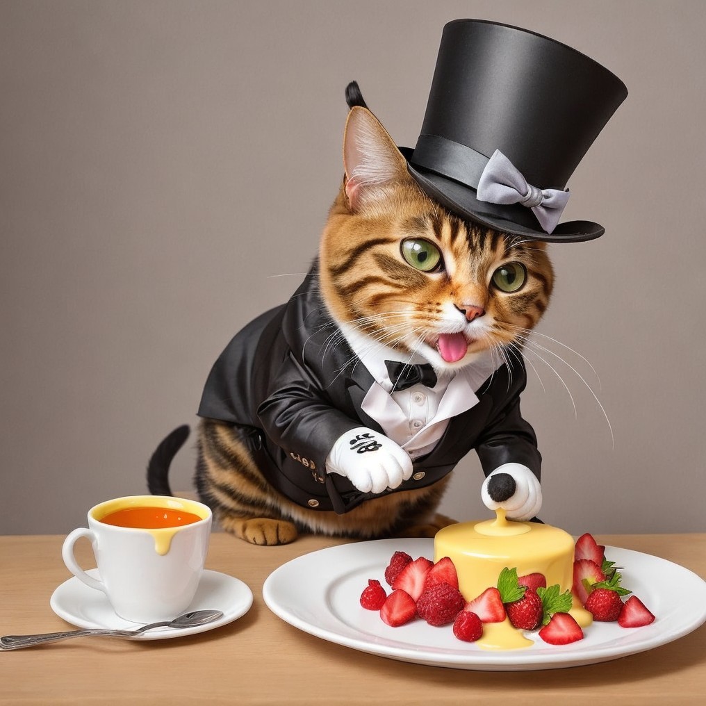 Anthropomorphic Cat Serving Pancakes in Classy Dining Room