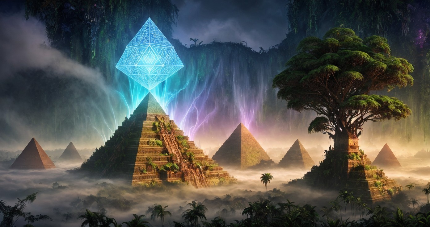 Magical wizard, Wizard casting a spell in a dense jungle with banana trees, vines, palm trees, ferns and waterfalls. Mysterious fog shrouds a surreal pyramid adorned with glowing intricately detailed geometric patterns, glowing runes and alchemical symbols, intricate psilocybin mushrooms (psilocybe cyanescens) flourishing at its base alongside colossal phosphorescent crystals. An ancient wizard, delving into time travel, alchemy, and magic, stands amidst the enigmatic scene. A UFO can be seen hovering above a hypnotic swirling portal. Embrace the allure of chaos magic, sacred geometry, and mystical occultism, with symbols such as the hamsa, eye of providence, talisman, and other esoteric elements intricately woven into the composition. Picture a pyramid basking under nebulae and galaxies with shimmering stars and planets, alluding to astral projection and mystical encounters. Infuse the artwork with intricate geometric patterns, cosmic wonders, trippy mushrooms, and psychedelic experiences, merging elements of sci-fi LSD art, magic mushrooms, and an enigmatic fantasy realm. Let the scene exude the essence of mysticism through vibrant colors and intricate details, seamlessly blending fantasy and reality to create a transcendent visionary art piece in the style of Cameron Gray. Ultra-realistic landscape.