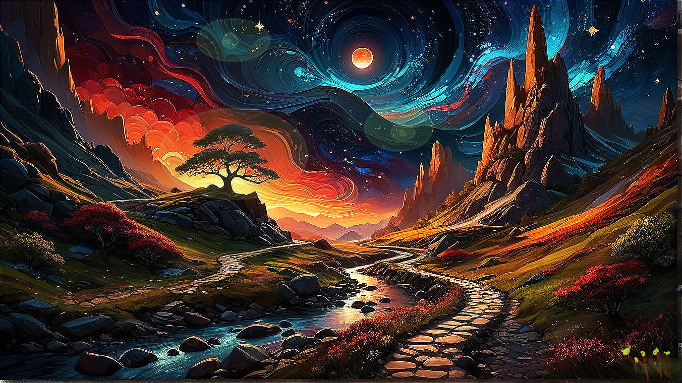 + Prompt:Elegant fantasy landscape. Medium shot. A winding rocky road and stream run through a mystical highland mountainscape with a beautiful tree and intricate path, set against a cosmic night sky with a burning red sun and stars. Bokeh. Vibrant oil on canvas textures, cinematic dynamic lighting, and psychedelic rock formations evoking intricate, colourful, fantasy wallpaper patterns. Expressive brushwork, florid details, and sweeping curves. Highly detailed, 8k resolution, atmospheric perspective, and fantastical vistas. Warm golden hour, with deep blues and purples in the shadows. Inspired by Van Gogh, Gustav Klimt, Vladimir Tretchikoff, Caspar David Friedrich, Virgil Finlay, and Yossi Kotler. Dreamlike textures.