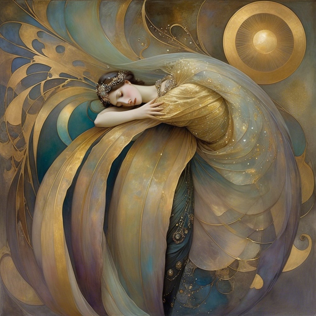 The image features an ethereal figure draped in flowing fabrics, adorned with delicate jewelry. Her pose conveys a sense of grace, with soft colors and celestial elements enhancing the mystical atmosphere.