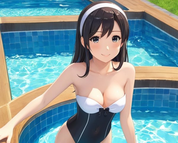 A whimsical character features a cute giraffe-themed design in a strapless swimsuit, showcasing vibrant colors and playful patterns, perfect for a fun summer vibe. Ideal for fans of charming anime aesthetics.