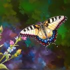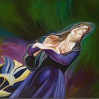 Woman in Purple Dress Against Swirling Green and Blue