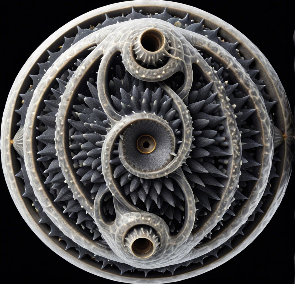 This intricate, spherical design features a blend of organic and geometric patterns, with radiating textures and a central eye-like feature, creating a mesmerizing visual effect.