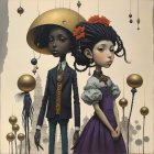 A whimsical scene featuring a girl in a purple dress with robotic elements and a humanoid robot with a vintage suit and an oversized hat, set against a cityscape with floating orbs.