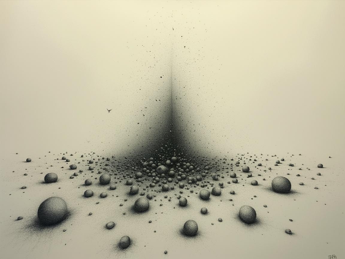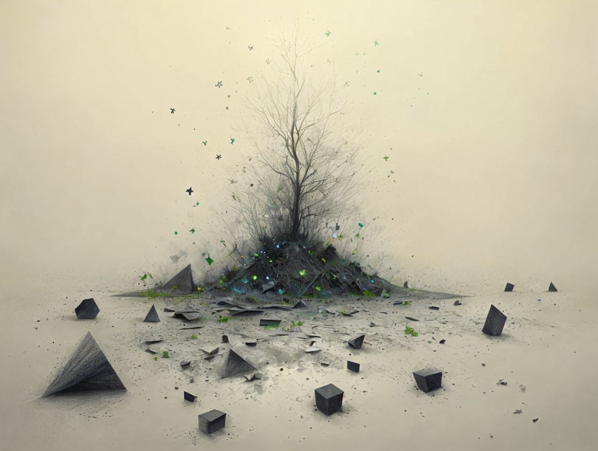 An abstract landscape features a solitary tree sprouting with green leaves atop a rocky mound. Surrounding it, geometric shapes in greys and greens create a surreal, dreamlike atmosphere.